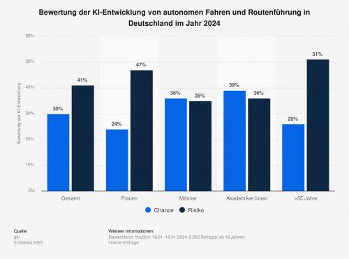 Den zunehmenden Einsatz von künstlicher Intelligenz in der Mobilität sehen insgesamt mehr Befragte als Risiko (41 Prozent) wie als Chance (30 Prozent). Zudem zeichnet sich auch ein deutlicher Geschlechterunterschied ab, wobei Frauen mit 47 Prozent ein deutlich größeres Risiko in der Entwicklung sehen. Auch die Altersgruppe von über 55 Jahren ist der Entwicklung eher negativ gegenüber eingestellt (51 Prozent).