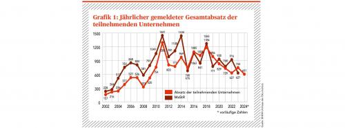 Grafik 1: Jährlicher gemeldeter Gesamtabsatz der teilnehmenden Unternehmen. Zur Vollansicht bitte auf die Grafik klicken Quelle: E&M / Öko-Institut |