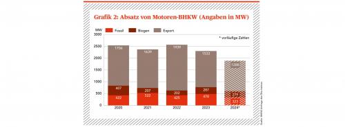 Grafik 2: Absatz von Motoren-BHKW in den Jahren 2011 bis 2024 (Angaben in MW). Zur Vollansicht bitte auf die Grafik klicken Quelle: Quelle: E&M / Öko-Institut |