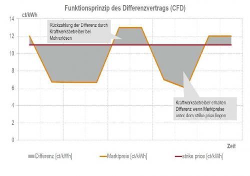 | Funktionsprinzip des Differenzvertrags (CFD) Bild: EWE - Zum Vergrößern bitte auf das Bild klicken. |