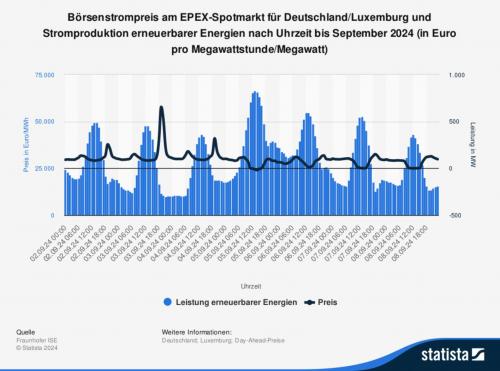 Die Leistung erneuerbarer Energien, wie zum Beispiel Windenergie und Photovoltaik, schwankt je nach Wetterbedingungen. Wenn viel erneuerbare Energie produziert wird, steigt das Angebot am Strommarkt, was zu einem niedrigeren Börsenstrompreis führen kann. Umgekehrt, wenn die Produktion von erneuerbaren Energien gering ist, kann der Börsenstrompreis steigen. Im Allgemeinen ist Strom aus erneuerbaren Energien günstiger als aus fossilen Energien. Von 2025 an sind Energieversorger gesetzlich dazu verpflichtet, ihren Kunden einen dynamischen Stromtarif anzubieten, um die Endverbraucherpreise enger mit der Preisentwicklung an der Strombörse abzustimmen.