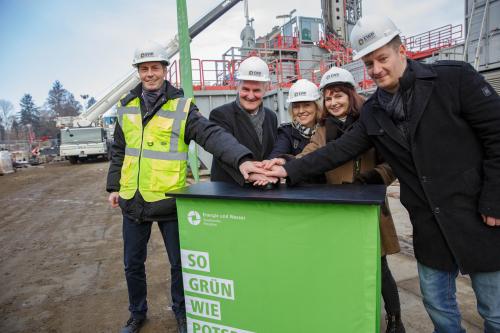 Beim symbolischen Start der Bohrungen für die Tiefengeothermie in Potsdam: von links Andre Gerstenberg (Fachleiter Infrastrukturprojekte EWP), Bernd Rubelt (Beigeordneter für Stadtentwicklung und Umwelt der Landeshauptstadt), Christiane Preuß (Geschäftsführerin), Cordula Schmaler (Bereichsleiterin Erzeugung), Tristan Grütter (Senior Projektleiter Infrastruktur, alle EWP) Quelle: EWP |