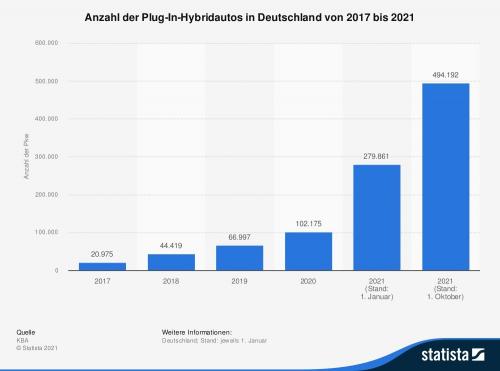 Der Bestand an Plug-In-Hybrid-Fahrzeugen steigt laut Zahlen des Kraftfahrtbundesamtes kontinuierlich: Am 1. Oktober 2021 waren in der Bundesrepublik rund 494.200 zugelassen. Zusammen mit den 517.000 rein elektrisch angetriebenen Autos nähert sich die Zahl der Elektroautos auf deutschen Straßen der Marke von einer Million.