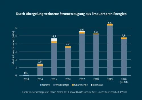 Das vorhandene Potenzial sollte besser genutzt werden. Übersicht über Strommengen, die von 2010 bis 2020 abgeregelt werden mussten. Zum Vergrößern bitte auf die Grafik klicken Quelle: BEE |