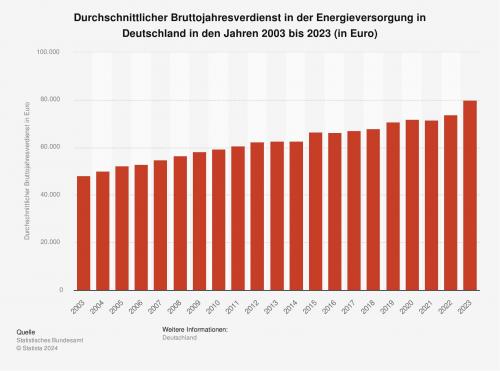 Die Statistik zeigt den durchschnittlichen Bruttojahresverdienst von Arbeitnehmern in der deutschen Energieversorgung nach Zahlen des Statistischen Bundesamts in den Jahren von 2003 bis 2023. Im Jahr 2023 betrug der durchschnittliche Bruttojahresverdienst in der Energieversorgung in Deutschland rund 79.800