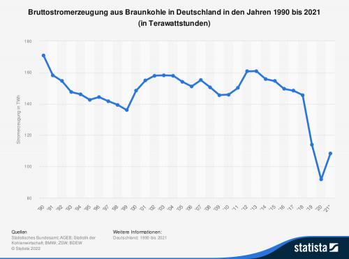 Die Statistik zeigt die Entwicklung der Bruttostromerzeugung aus Braunkohle in Deutschland in den Jahren 1990 bis 2021. Im Jahr 2021 wurden in Deutschland rund 108,3 Terawattstunden Strom aus dem fossilen Energieträger Braunkohle erzeugt. Quellen: BDEW; Statistisches Bundesamt; BMWi; AGEB; Statistik der Kohlenwirtschaft; ZSW