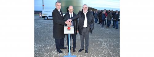 Lichtenaus Bürgermeister Josef Hartmann (r.) in seinem Element: Im November 2016 weihte er zusammen mit Hermann Dirkgreber (l.), Geschäftsführer der Stadtwerke Lichtenau, und Franz-Josef Lersch-Mense, dem damaligen NRW-Minister für Bundesangelegenheiten, Europa und Medien sowie Chef der Düsseldorfer Staatskanzlei, den Windpark Hakenberg ein Bild: Privat |
