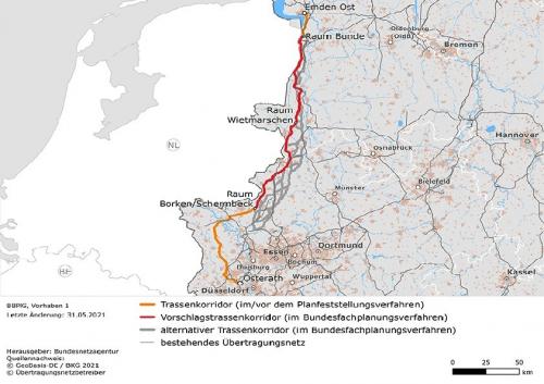 Die Stromleitung wird den Rhein bei Rees im Kreis Kleve queren, wie die Behörde am 7. Juni bekannt gab. Damit ist der gut 100 Kilometer lange Abschnitt zwischen Borken im Münsterland und dem Endpunkt der Leitung in Osterath bei Neuss abgesteckt.
