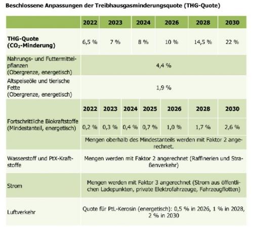 Der vorgeschriebene Anteil von "fortschrittlichen Biokraftstoffen" soll von derzeit null auf mindestens 1,75 % bis 2030 steigen. Fortschrittliche Biokraftstoffe werden aus Reststoffen wie Stroh und Gülle, Altspeiseölen und erstmals auch tierischen Abfallstoffen gewonnen. Diese Form des "Recycling" sei nachhaltig und soll ab einer bestimmten Höhe mit einer doppelten Anrechnung innerhalb der THG-Quote gefördert werden, so das Bundesumweltministerium.