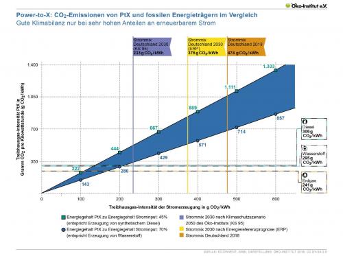 Gramm CO2-Ausstoß pro hineingesteckte kWh Strom sind alle Power-to-X-Technologien im laufenden Betrieb klimaschonender als die genannten fossilen Brennstoffe.