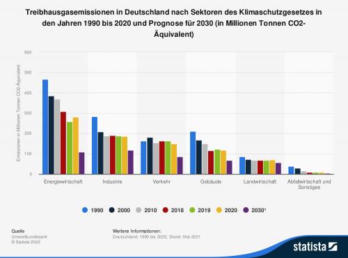 % gegenüber dem Jahr 1990 reduziert werden. Das Klimaschutzgesetz gibt einzelne Emissionsziele für die in der Statistik aufgeführten Sektoren bis zum Jahr 2030 vor. Erhoben werden die Zahlen vom Umweltbundesamt.