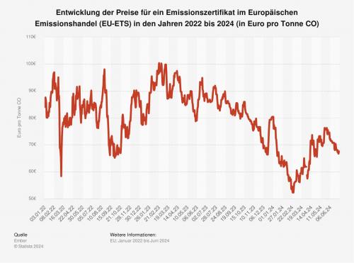 Euro/Tonne CO2 ein Rekordhoch, sank aber bis Ende Februar 2024 auf 56