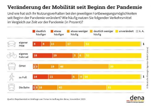 Fast jeder Dritte hat sein Mobilitätsverhalten während der Corona-Pandemie geändert, geht aus einer Umfrage der Deutschen Energie-Agentur (Dena) hervor.