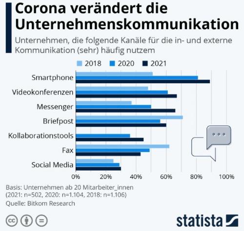Corona-Pandemie verändert einer aktuellen Bitkom-Studie zufolge die Art wie Unternehmen kommunizieren. Besonders stark zugelegt hat demnach die Nutzung von Messengern und Kollaborationstools wie Teams und Slack. Auch Videokonferenzen sind jetzt deutlich verbreiteter als vor der Pandemie, wie der Blick auf die Statista-Grafik deutlich macht.