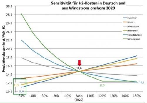 Entscheidender für den Wasserstoffpreis seien dagegen anlagenspezifische Kostenfaktoren wie Betriebskosten, Lebensdauer und Wirkungsgrad von Elektrolyseuren. Den größten Hebel zur Kostensenkung macht Merten im Wirkungsgrad aus: "Wenn wir den Wirkungsgrad um 20 % verbessern, hat das den stärksten Einfluss auf die Kostensenkung", so Merten mit Blick auf die inländische Wasserstoffproduktion aus Strom von Onshore-Windkraftanlagen.