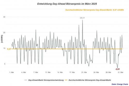 Der durchschnittliche Großhandelsstrompreis im Day-Ahead-Markt der Epex-Strombörse hat im März bei 9,47