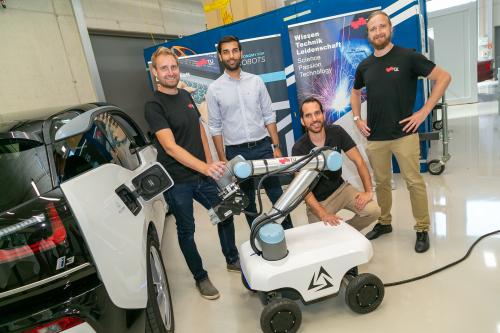 Sie stecken hinter der Entwicklung des autonomen mobilen E-Laderoboter (von links): Bernhard Walzel (TU Graz), Ehsan Zadmard (Alveri), Konstantin Mautner-Lassnig (ARTI Robots) und Helmut Brunner (TU Graz) Quelle: TU Graz, Robert Frankl |