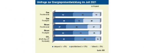 Für Juni waren die Teilnehmer bei Erdgas und Strom optimistisch, lediglich bei den CO2-Emissionsrechten ging die Mehrheit von fallenden Preisen aus. Für die Preise im Juli gibt es hingegen keinen einheitlichen Trend. Doch überwiegend sind die Teilnehmer etwas weniger optimistisch.