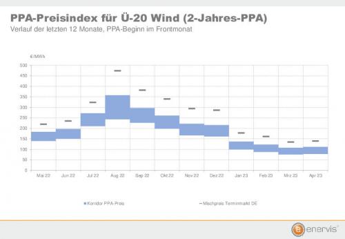 Der Mischpreis für einen zweijährigen Wind-PPA mit Beginn im Frontmonat lag im April 2023 bei rund