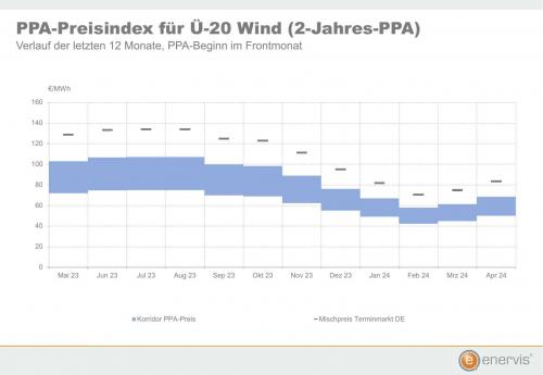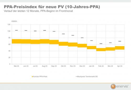 Euro/MWh. Diese hängt neben dem Terminmarkt-Mischpreis von Standort, Anlagentyp und weiteren PPA-Parametern ab. Im März hatte die PPA-Preisrange Enervis zufolge zwischen 45