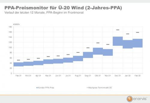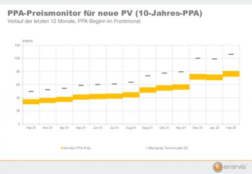 Die Preise grünen Power Purchase Agreements (PPA) zur Direktlieferung aus Erneuerbaren-Anlagen in Deutschland haben im Februar fast zu den Höhenflügen vom Dezember 2021 zurückgefunden. Bei zehnjährigen Photovoltaik-PPA wurde die Preis-Bandbreite sogar übertroffen. Das zeigt der neue "PPA-Preisindex" von E&M und dem Analysehaus Enervis.