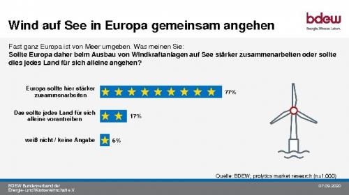 Insbesondere auf europäischer Ebene sollte es nach Ansicht der Befragten mehr Zusammenarbeit beim Ausbau von Windkraftanlagen auf See geben. So stimmten 77 % der Aussage zu „Europa sollte hier stärker zusammenarbeiten“. Nur 17 % hingegen finden: „Das sollte jedes Land für sich alleine vorantreiben.“