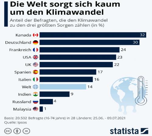 Die meisten Menschen haben die Klimaveränderungen bereits als großes Problem begriffen, nur die wenigsten würden sie allerdings zu den drei größten Sorgen ihrer Nation zählen. Das zeigt die Statista-Grafik auf Basis einer aktuellen Ipsos-Umfrage. Weltweit würden nur etwa 14 Prozent der Befragten zustimmen, dass sich Klimawandel und Erderwärmung unter den drei größten Herausforderungen der Gegenwart befinden. Am ehesten besorgt wegen des Klimas sind die Einwohnerinnen und Einwohne Kanadas (32 %) und Deutschlands (30 %). In Malaysia hingegen zählt nur ein Prozent der Befragten Klimawandel zu den Top 3 Sorgen, in Russland sind es etwa vier Prozent.
