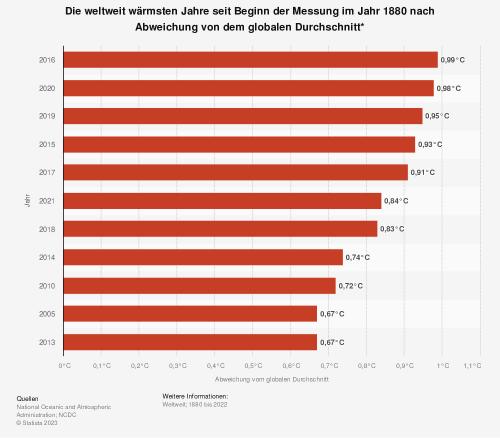 Das weltweit wärmste Jahr seit Beginn der Messungen im Jahr 1880 war nach Zahlen der National Oceanic and Atmospheric Administration und NCDC das Jahr 2016 mit einer Abweichung von dem globalen Durchschnitt von 0,99 Grad Celsius. Aufgelistet werden die zehn wärmsten Jahre seit Beginn der Messungen. Von den insgesamt also 150 möglichen Jahren sind die zehn wärmsten Jahre nach Abweichung vom globalen Durchschnitt in den vergangenen 16 Jahren gewesen.