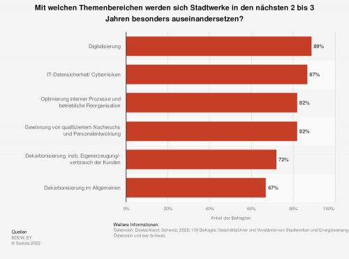 Prozent der Befragten an, dass sich Stadtwerke stark beziehungsweise sehr stark mit der Digitalisierung auseinandersetzen werden. Dies ging aus einer Umfrage des Verbandes BDEW unter 100