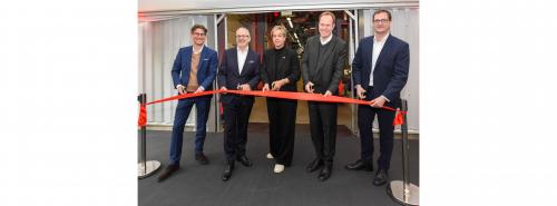 Henkel-Standortleiter Daniel Kleine, CEO Carsten Knobel, Ministerin Mona Neubaur, Düsseldorfs Oberbürgermeister Stephan Keller und Stadtwerke-Chef Julien Mounier bei der Eröffnung der Energiezentrale für das Fernwärme-Projekt von Henkel und den Stadtwerken (v.l.n.r.).