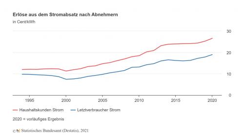 Die Energieversorgungsunternehmen in Deutschland haben im vergangenen Jahr bei der Abgabe von Strom an Haushaltskunden im Durchschnitt 26,6 Cent je Kilowattstunde eingenommen. Nach vorläufigen Angaben des Statistischen Bundesamtes (Destatis) waren das 5,4 % mehr als im Jahr 2019.