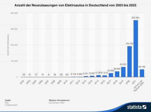 2021 wurden mit rund 356.000 mehr Pkw mit reinem Elektroantrieb neu zugelassen als jemals zuvor. Das Jahr 2022 startete mit einem Zuwachs von 28,1 Prozent im Vergleich zum Januar des Vorjahres und sogar 54,9 Prozent im Februar-Vergleich.