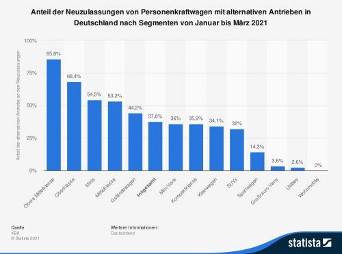 Von Januar bis März 2021 waren etwa 85,8 % der Pkw-Neuzulassungen im Segment obere Mittelklasse mit einem alternativem Antrieb ausgestattet. Insgesamt wurden in diesem