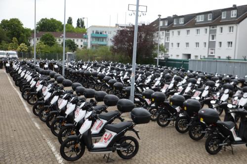 Ein Bild aus den vergangenen Expansionszeiten: "Rhingo"-Elektromopeds der Rheinenergie in Reih und Glied zum Ausleihen. Quelle: Rheinenergie |