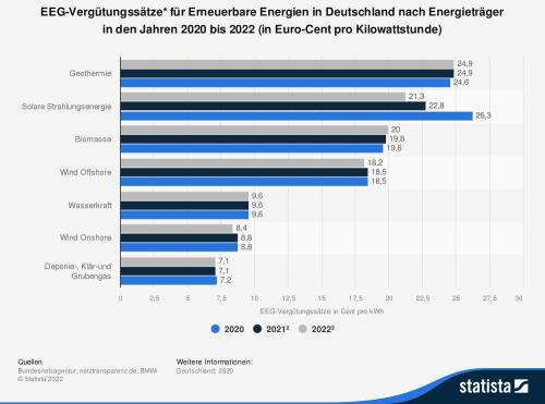 Die Statistik zeigt die durchschnittlichen EEG-Vergütungssätze für Erneuerbare Energien in Deutschland nach Energieträger im Jahr 2020 und eine Prognose für die Jahre 2021 und 2022. Im Jahr 2020 wurde Biomasse laut den Regelungen des Erneuerbare-Energie-Gesetztes mit durchschnittlich 19,6 Cent pro Kilowattstunde eingespeisten Stroms gefördert.