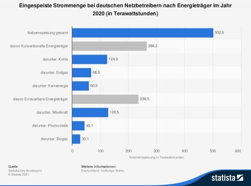 Laut vorläufigen Angaben des Statistischen Bundesamts wurden im Jahr 2020 rund 502,6 Mrd. Kilowattstunden Strom bei deutschen Netzbetreibern eingespeist. Die Windkraft machte dabei den größten Anteil aus.