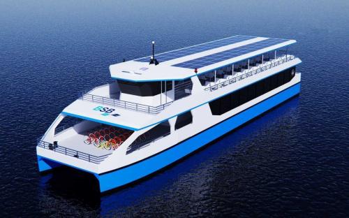 „Die E-Schiffe sind kleiner und durch die Aluminium-Konstruktion leichter als die Standardschiffe“, sagt Christoph Witte. „Um dennoch ausreichend Platz für unsere Fahrgäste bei gleichzeitig niedrigem Schiffswiderstand und Energieverbrauch realisieren zu können, haben wir uns für das Katamaran Prinzip entschieden“, so der technische Leiter der BSB.