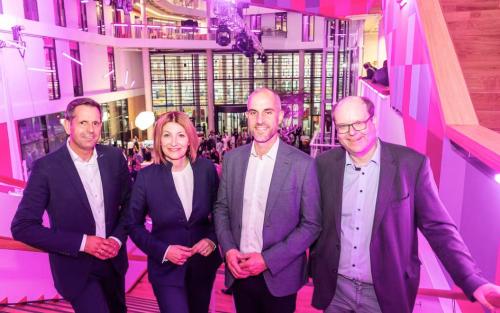 | Olaf Lies, Susanna Zapreva, Belit Onay und Christian Meyer im Atrium der neuen Zentrale, Quelle: Enercity |