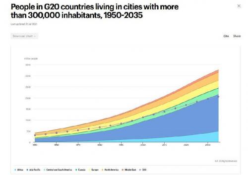 Entwicklung der Bevölkerung in den G20-Ländern, die in Städten mit über 300.000 Einwohnern leben Zum Vergrößern bitte auf die Grafik klicken. Quelle: IEA |