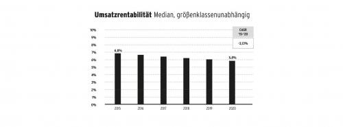 Die Analyse der Umsatzrentabilität zeigt laut BET, dass die Profitabilität über alle Größenklassen sinkt. Im Betrachtungszeitraum von 2015 bis 2020 fällt der Median – also derjenige Wert, der genau „in der Mitte“ liegt – von 6,8 auf 5,8