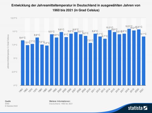 Die Durchschnittstemperatur im Jahr 2021 betrug in Deutschland 9,1 Grad Celsius. Damit war 2021 hierzulande eines der wärmsten Jahre seit Beginn der Temperaturaufzeichnungen im Jahr 1881. Von den zehn wärmsten Jahren Deutschlands waren bisher alle seit der letzten Jahrtausendwende.