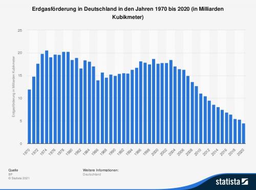 Die Statistik zeigt die Erdgasförderung in Deutschland von 1970 bis 2020. Die Werte sind in Milliarden Standardkubikmeter (gemessen bei 15°C und 1.013 mbar) angegeben. Nicht berücksichtigt wurden Fackelgas und Recyclinggas. Im Jahr 2020 betrug die Erdgasförderung in Deutschland rund 4,5 Milliarden Kubikmeter.