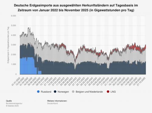 Neben Erdöl dient Erdgas in Deutschland als zentraler Brennstoff für die Primärenergieerzeugung. Da der Bedarf nach dem Rohstoff nicht durch die nationale Erdgasförderung gedeckt werden kann, ist das Land in einem hohen Ausmaß auf Einfuhren aus dem Ausland angewiesen. Neben Norwegen sind Belgien und die Niederlande (Stand: Oktober 2025) die wichtigsten Erdgasbezugsquellen für Deutschland, nachdem Russland im Laufe des Jahres 2022 dessen Erdgasexporte über die Nord Stream 1 Pipeline systematisch drosselte und Ende August 2022 vollständig einstellte.