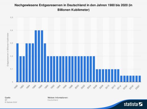 Die Statistik zeigt die nachgewiesenen Erdgasreserven von Deutschland nach Zahlen von BP im Zeitraum von 1980 bis 2020. Zu den nachgewiesenen Erdgasreserven zählen im Allgemeinen Mengen, die nach geologischen und ingenieurtechnischen Informationen aller Wahrscheinlichkeit nach aus den heute bekannten Vorkommen und unter den derzeitigen wirtschaftlichen und technischen Bedingungen künftig gefördert werden können. Im Jahr 2020 verfügte Deutschland über Erdgasreserven von rund 0,05 Billionen Kubikmetern Gas.