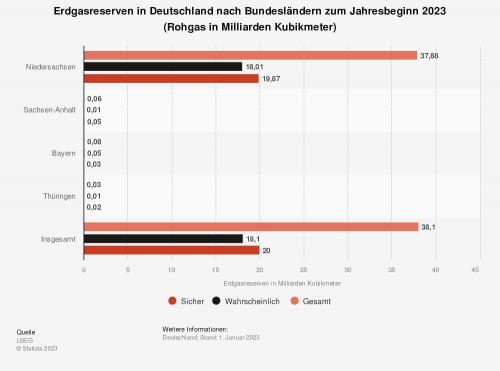 Zu Beginn des Jahres 2023 betrugen die sicheren und wahrscheinlichen Erdgasreserven in Deutschland rund 38