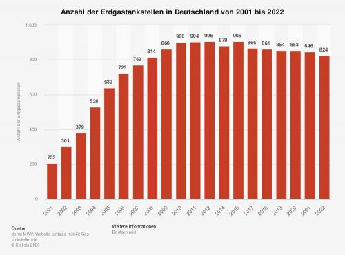 Erneut weniger Erdgastankstellen in Deutschland – die Anzahl der Tankstellen, an denen sich Erdgas-betriebene Fahrzeuge auftanken lassen, lag im Jahr 2022 mit 824 unter dem Vorjahreswert. Der Bestand an Erdgastankstellen ist seit dem Jahr 2016 rückläufig. Die meisten Tankstellen dieser Art gab es im Jahr 2012. Die Zahlen basieren auf Angaben der Deutschen Energie-Agentur (Dena), dem Mineralölwirtschaftsverband (MWV) und der Internetseite gas-tankstellen.de.