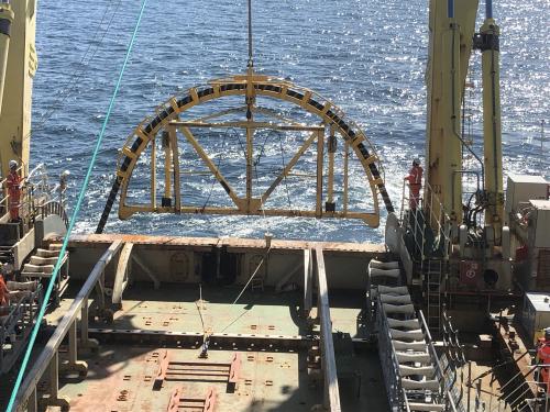 Hertz hat zwei 220-kV-Seekabelsysteme erfolgreich in die Plattform Baltic Eagle eingezogen. Zuvor hatte der Kabelleger Ndurance die Leitung vor der Anlage auf dem Meeresboden platziert (Foto). Im Februar war die Umspannplattform am Bestimmungsort nordöstlich der Insel Rügen installiert worden.