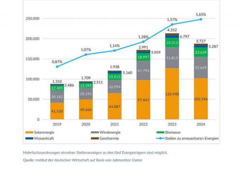 Die Analyse basiert auf 60 Millionen Online-Stellenanzeigen zwischen 2019 und 2024 und wurde vom IW Köln durchgeführt. Während die Gesamtzahl der Stellenangebote in Deutschland im vergangenen Jahr um 16 Prozent zurückging, sank die Zahl in der Energiewendebranche nur um 8 Prozent. Die Bertelsmann Stiftung stellt die Daten des Jobmonitors monatsaktuell im Internet bereit.