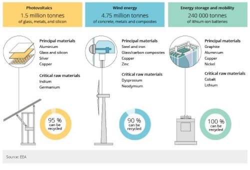 Welche Stoffe beim Recycling von erneuerbaren Energieanlagen zurückgewonnen werden können Quelle: EEA |
