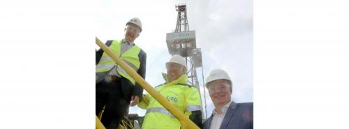 Sven Krueger, Geschäftsführer von Baker Hughes, zeigt LBEG-Präsident Carsten Mühlenmeier und SVO-Geschäftsführer Holger Schwenke (von links) die Bohranlage in Ahnsbeck Quelle: LBEG/Eike Bruns |